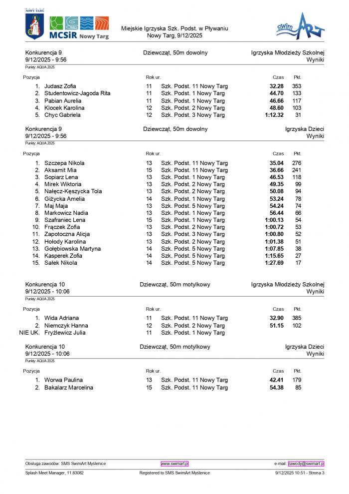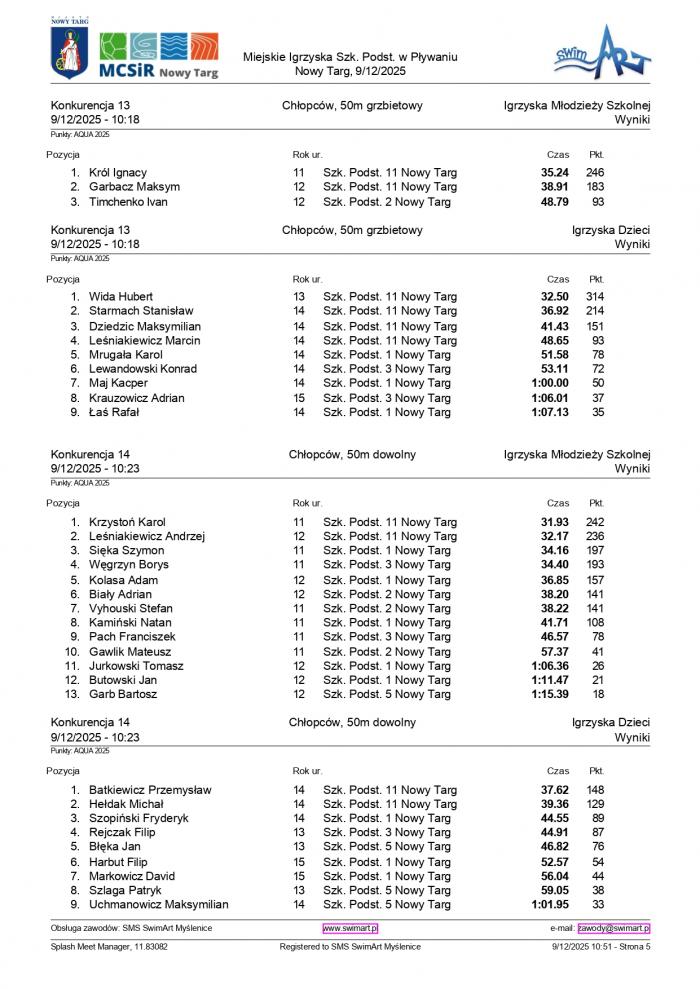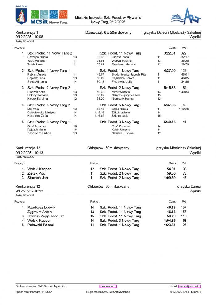 Miejskie Igrzyska Szkół Podstawowych w pływaniu potwierdziły duże zainteresowanie sportem wśród uczniów nowotarskich szkół. Zawody przebiegły sprawnie i w sportowej atmosferze, a wysoki poziom rywalizacji był widoczny we wszystkich konkurencjach. Poniżej wyniki wszystkich konkurencji