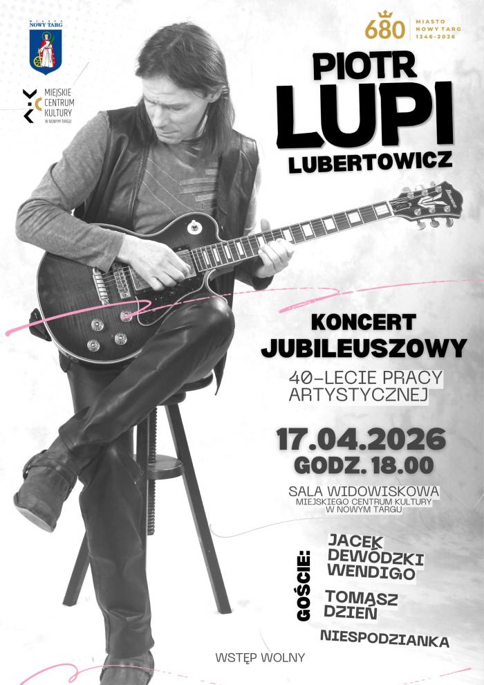 W piątek, 17 kwietnia, w sali Miejskiego Centrum Kultury w Nowym Targu odbędzie się koncert przygotowany z okazji czterdziestolecia działalności scenicznej Piotra „Lupiego” Lubertowicza. Początek wydarzenia zaplanowano na godzinę 18.00.