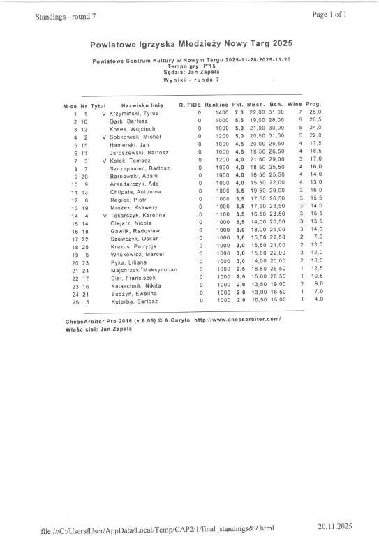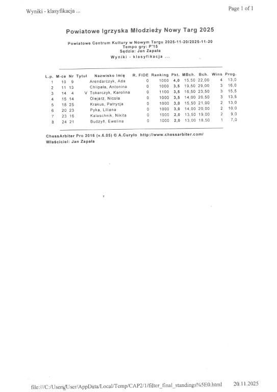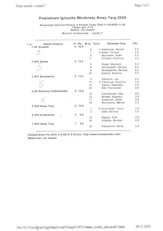 20 listopada 2025 roku w siedzibie Powiatowego Centrum Kultury w Nowym Targu odbyły się Powiatowe Igrzyska Młodzieży Szkolnej w szachach indywidualnych oraz drużynowych pod patronatem Starosty Powiatu Nowotarskiego i Burmistrza Miasta Nowy Targ.