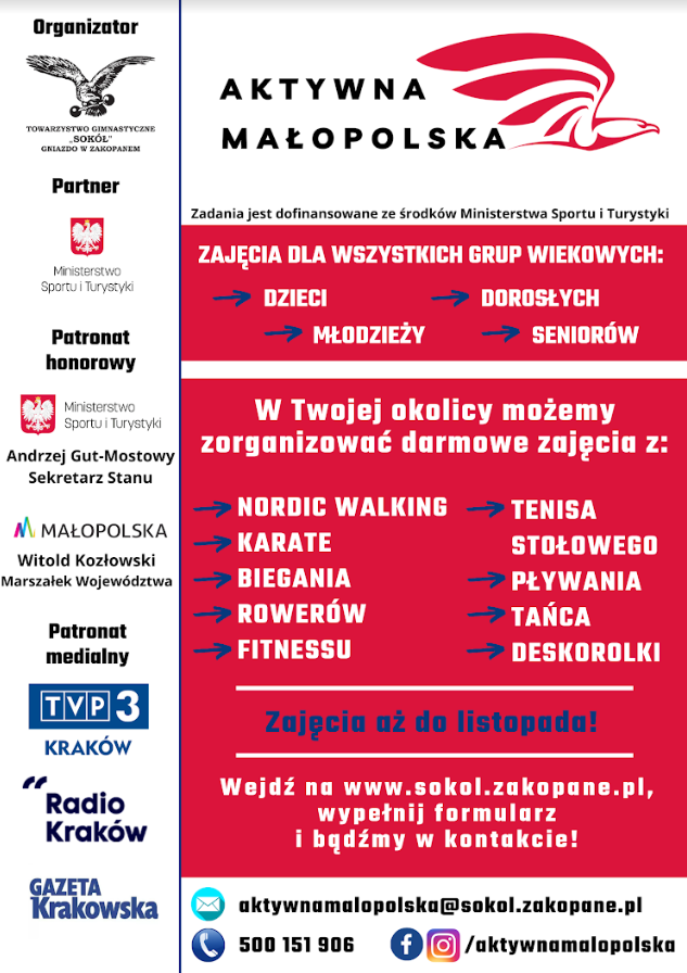 Towarzystwo Gimnastyczne Sokół Gniazdo w Zakopanem startuje ze sportową ofertą dla mieszkańców Małopolski - dla dzieci, młodzieży, dorosłych i seniorów. Każdy znajdzie aktywność dla siebie.
