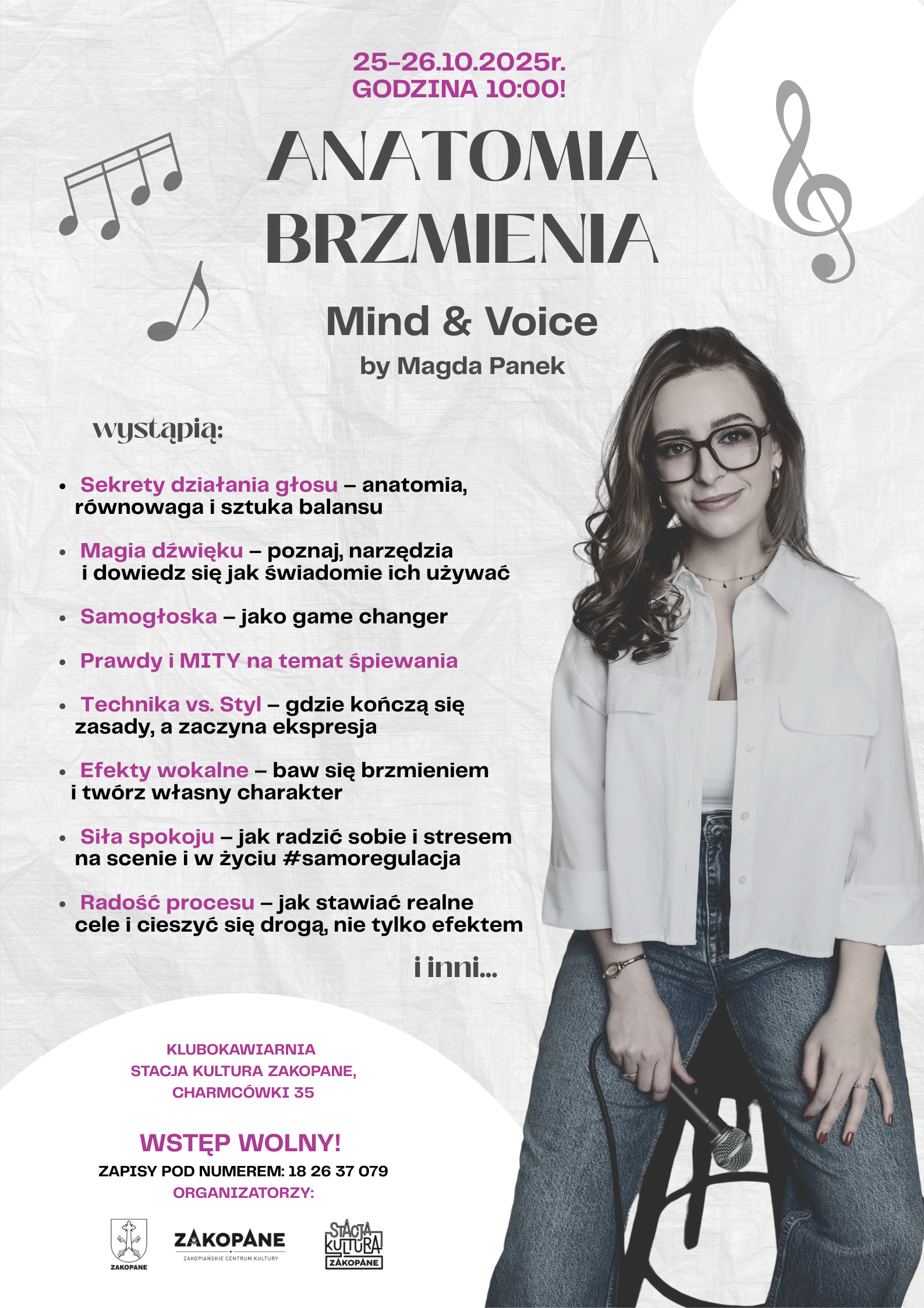 W dniach 25 i 26 października 2025 roku w Klubokawiarni Stacja Kultura Zakopane przy ulicy Chramcówki 35 odbędą się dwudniowe warsztaty wokalne „Anatomia Brzmienia – mind & voice” prowadzone przez Magdę Panek.