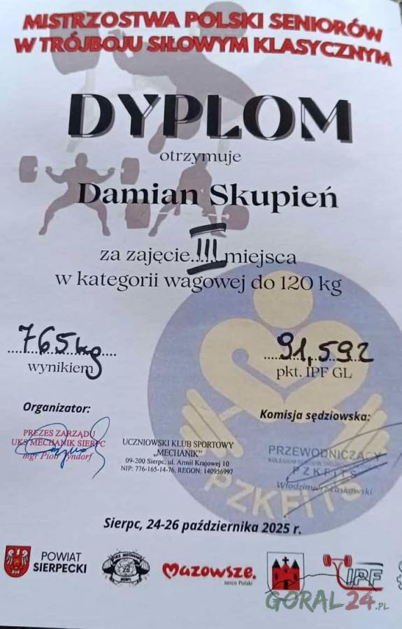Damian Skupień z Poronina zdobył brązowy medal w kategorii do 120 kg podczas mistrzostw Polski seniorów w trójboju siłowym klasycznym, które odbyły się w Sierpcu w dniach 24–26 października 2025 roku. Jego znakomity występ przyniósł mu trzecie miejsce i uznanie zarówno sędziów, jak i kibiców obecnych na zawodach.