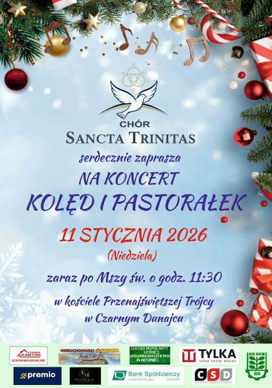 Chór „Sancta Trinitas” zaprasza na koncert kolęd i pastorałek, który odbędzie się w niedzielę 11 stycznia w kościele parafialnym w Czarnym Dunajcu. Występ rozpocznie się bezpośrednio po Mszy Świętej o godzinie 11:30.