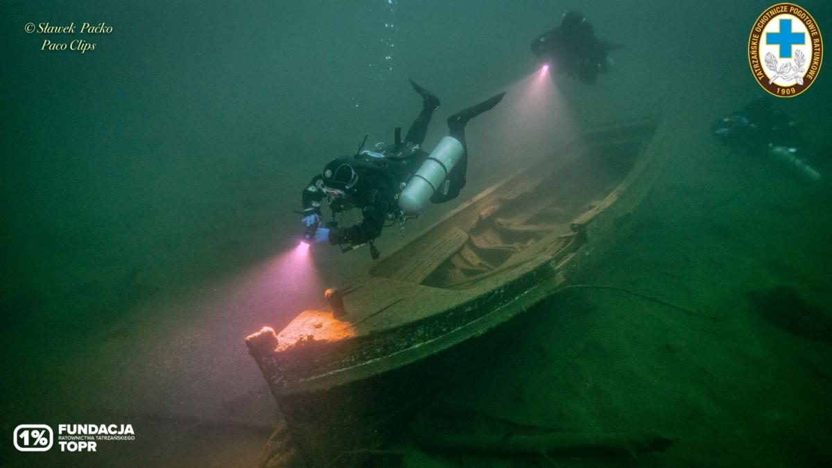 Łódź widoczna na zdjęciach to “Syrena”, która przed laty służyła do przewozu turystów poprzez taflę Morskiego Oka. Przez lata zaginiona, odnaleziona została 5lat temu przez nurków TOPR przy okazji działań szkoleniowych.
