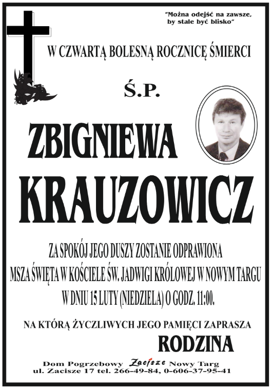 W czwartą rocznicę śmierci śp. Zbigniewa Krauzowicza za spokój jego duszy zostanie odprawiona Msza Święta w kościele św. Jadwigi Królowej w Nowym Targu w niedzielę, 15 lutego, o godz. 11.00. Na wspólną modlitwę w intencji Zmarłego zaprasza jego rodzina.