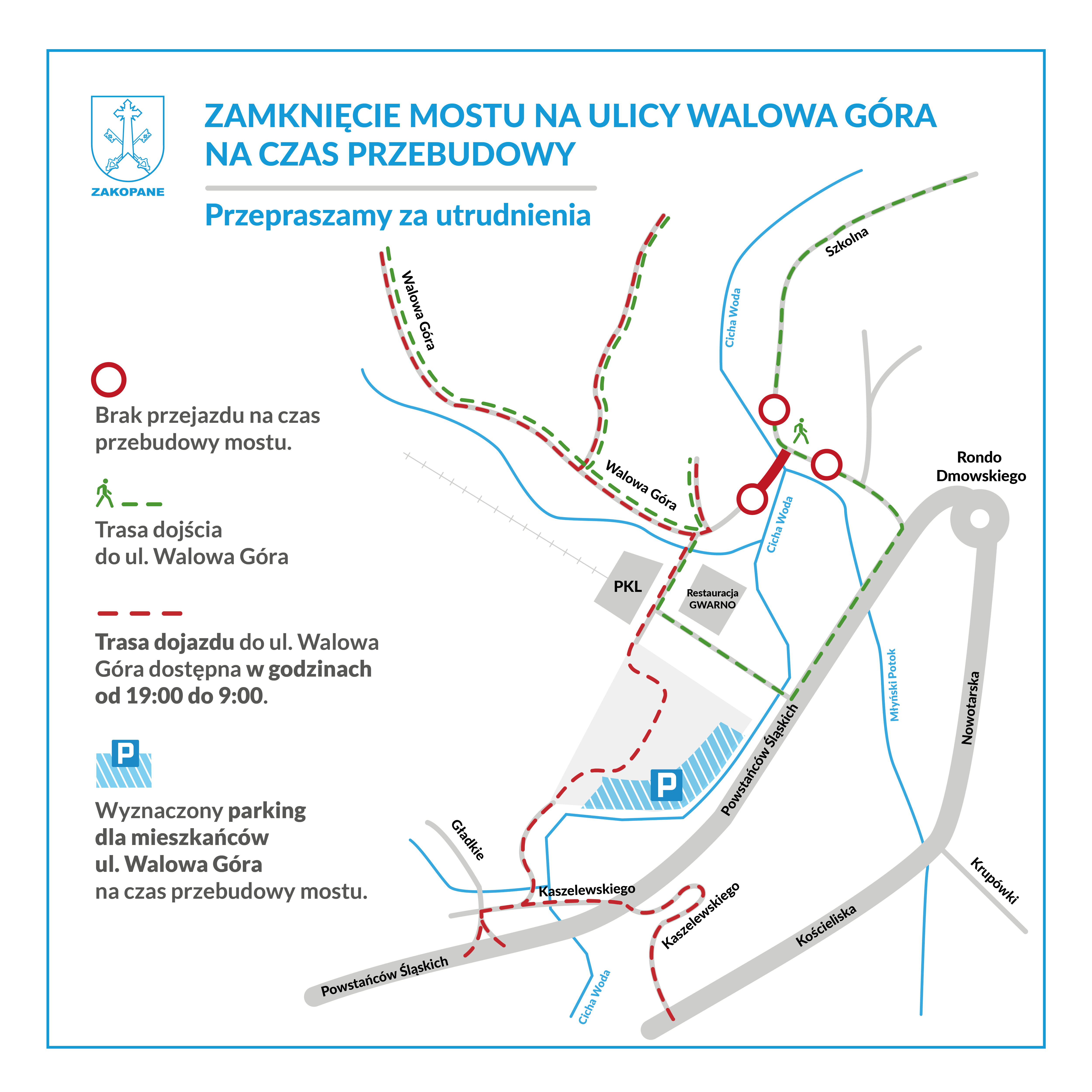 Urząd Miasta Zakopane poinformował o wprowadzeniu czasowych zmian w organizacji ruchu w związku z planowaną inwestycją drogową obejmującą rozbiórkę dotychczasowego mostu oraz budowę nowego obiektu w ciągu ulicy Walowa Góra.
