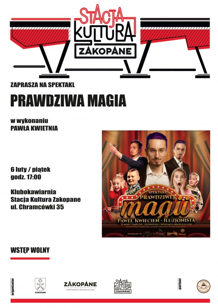 6 lutego 2026 roku w piątek o godzinie 17.00 w Klubokawiarni Stacja Kultura w Zakopanem przy ulicy Chramcówki 35 odbędzie się familijny spektakl iluzji pod tytułem Prawdziwa Magia.