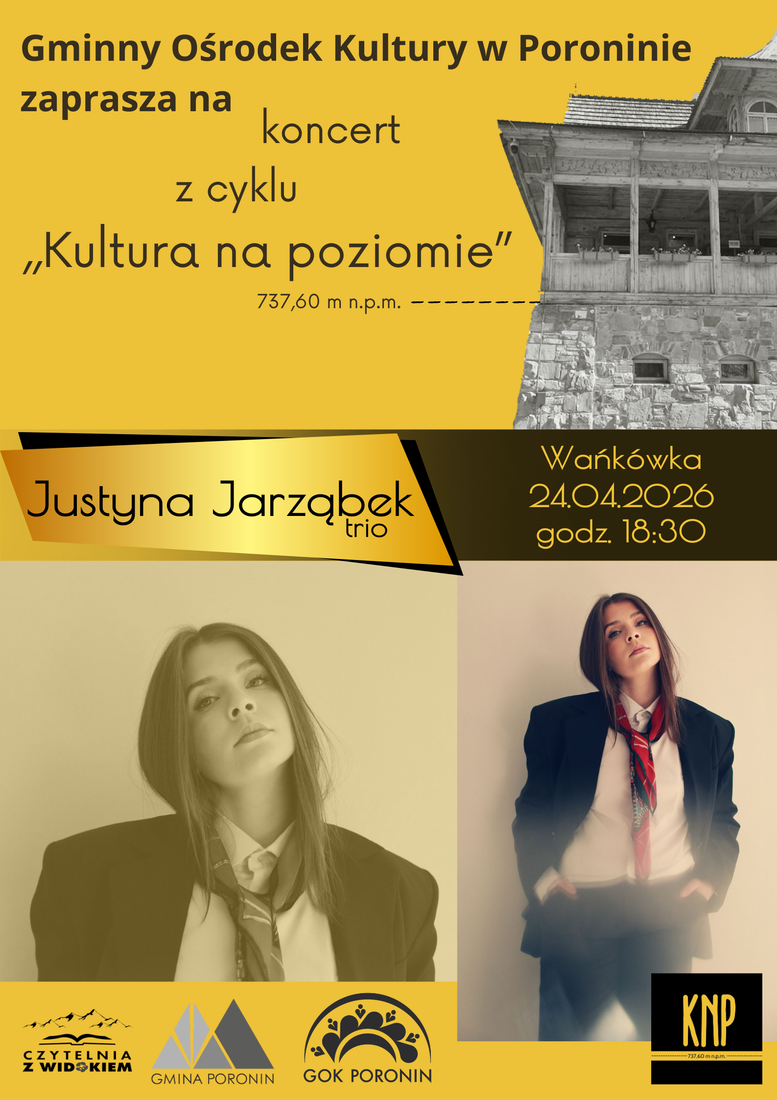 W Gminnym Ośrodku Kultury w Poroninie odbędzie się kolejny koncert z cyklu „Kultura Na Poziomie”. Tym razem przed publicznością wystąpi Justyna Jarząbek Trio.