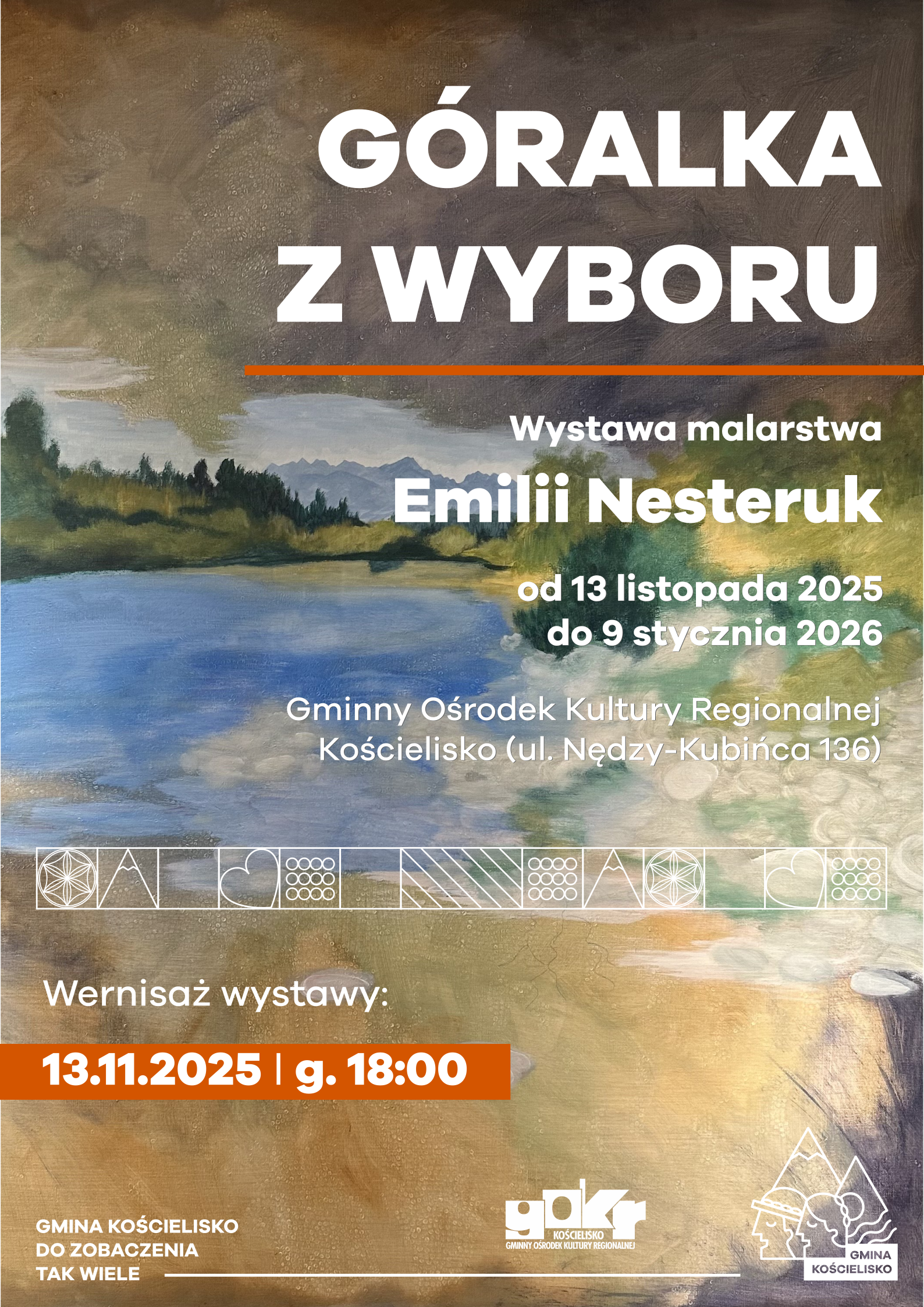 W czwartek 13 listopada 2025 roku o godzinie 18.00 w Gminnym Ośrodku Kultury Regionalnej w Kościelisku przy ulicy Nędzy-Kubińca 136 odbędzie się wernisaż wystawy Emilii Nesteruk zatytułowanej „Góralka z wyboru”. Ekspozycja będzie dostępna dla zwiedzających do 9 stycznia 2026 roku.