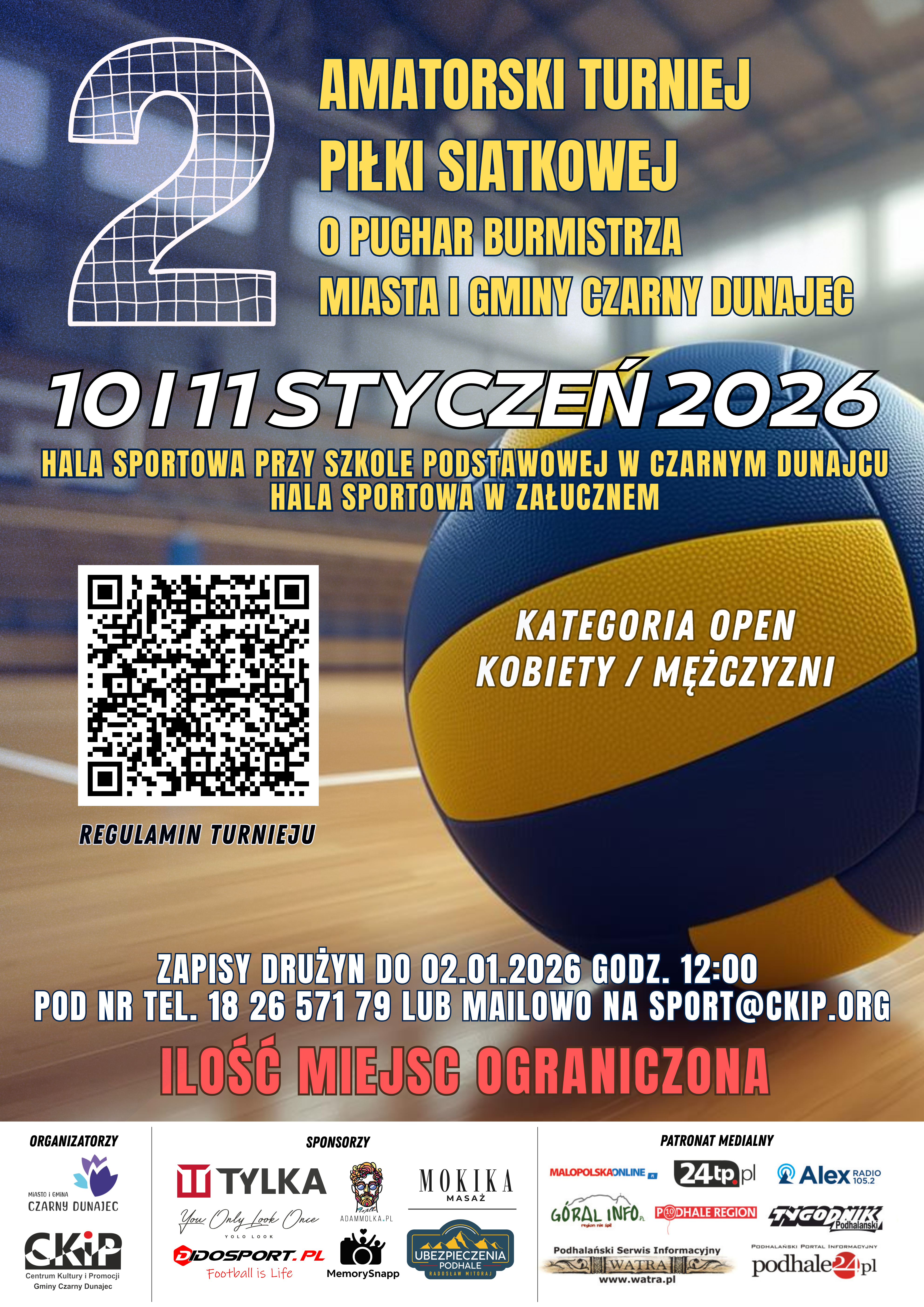 Już niebawem w weekend 10 i 11 stycznia 2026 r. hale sportowe w Czarnym Dunajcu i Załucznem wypełnią się sportowymi emocjami. Organizatorzy zapraszają wszystkich mieszkańców i sympatyków sportu do udziału w II Amatorskim Turnieju Piłki Siatkowej o Puchar Burmistrza Miasta i Gminy Czarny Dunajec.