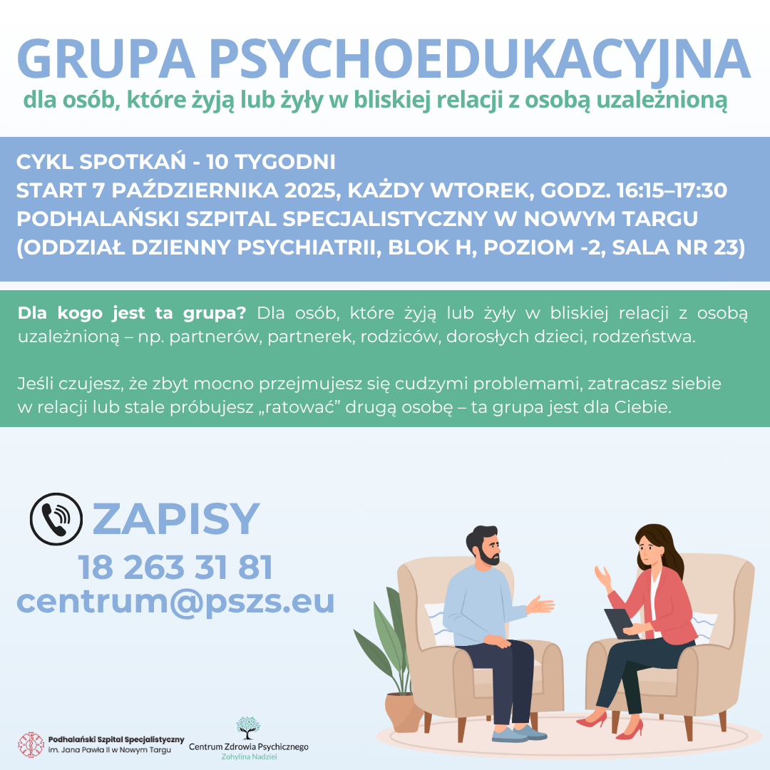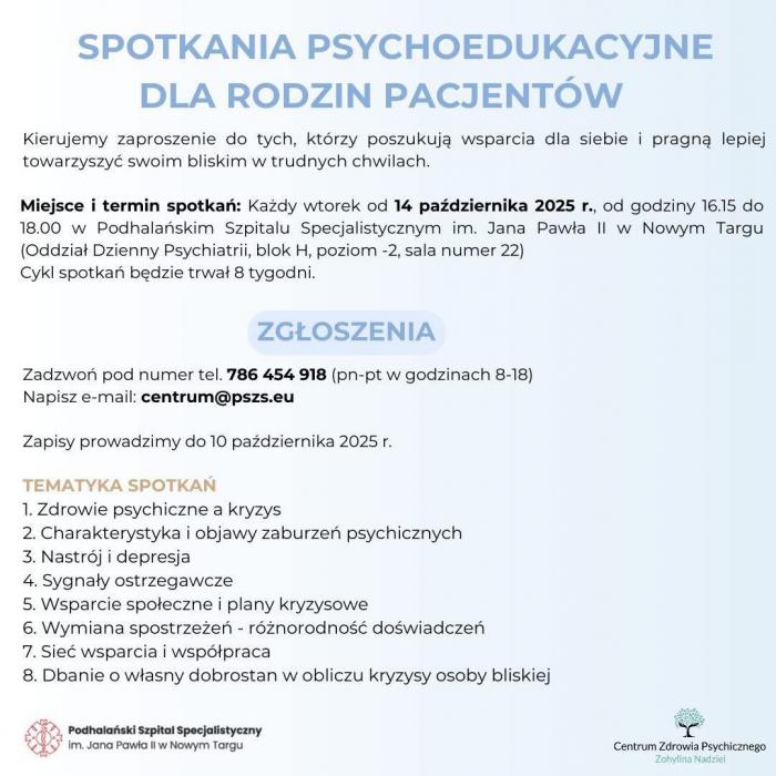 Również od października rusza 8-tygodnoowy cykl spotkań psychoedukacyjnych dla rodzin pacjentów. W każdy wtorek, począwszy od 14 października, w Podhalańskim Szpitalu Specjalistycznym bliscy osób w kryzysie psychicznym będą mogli zdobywać wiedzę i wsparcie. Spotkania obejmą osiem bloków tematycznych, m.in. o depresji, sygnałach ostrzegawczych, wsparciu społecznym i sieci współpracy.