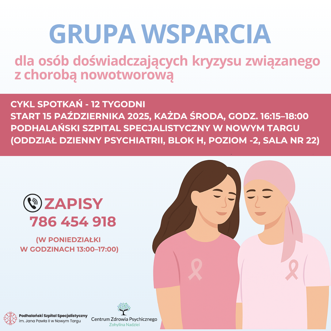 15 października 2025 r. rusza grupa wsparcia dla osób doświadczających kryzysu związanego z chorobą nowotworową. Spotkania będą odbywać się w każdą środę przez 12 tygodni w godz. 16.15-18.00 w Podhalańskim Szpitalu Specjalistycznym w Nowym Targu.