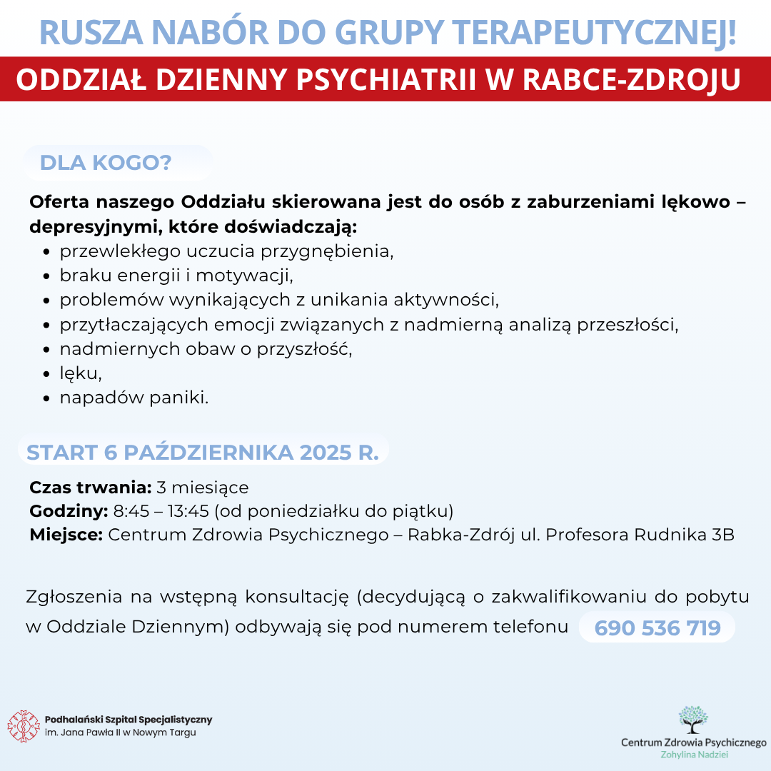 6 października 2025 r. rusza 3-miesięczny program terapeutyczny skierowany do osób z zaburzeniami lękowo-depresyjnymi, które zmagają się m.in. z obniżonym nastrojem, brakiem energii, napadami paniki czy nadmiernym lękiem o przyszłość. Zajęcia odbywać się będą od poniedziałku do piątku w godzinach 8.45–13.45 w Centrum Zdrowia Psychicznego w Rabce.