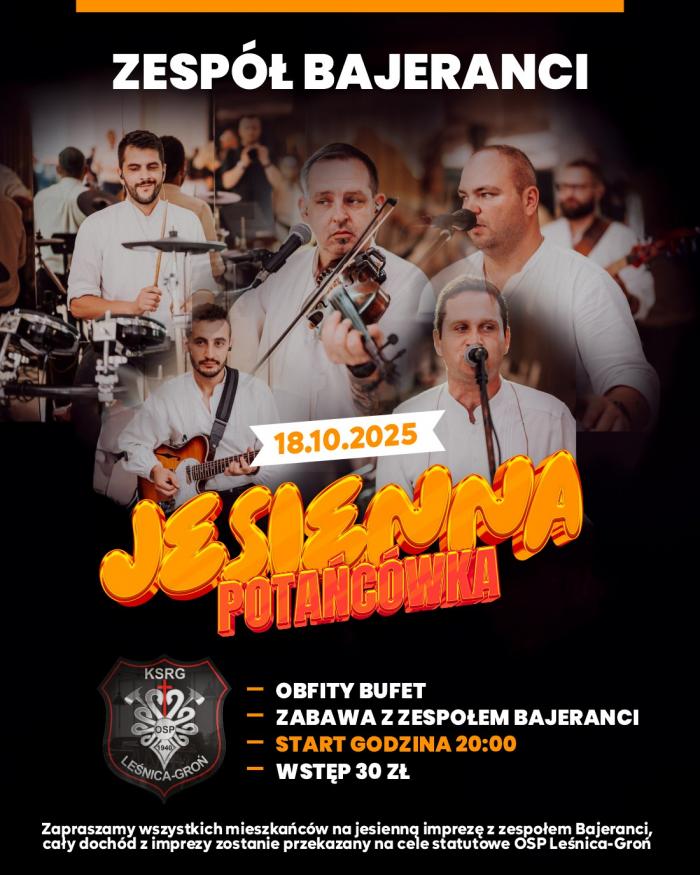 Strażacy z OSP Leśnica-Groń zapraszają wszystkich mieszkańców na jesienną potańcówkę, która odbędzie się w sobotę 18 października 2025 roku. Start zabawy o godzinie 20.00.
