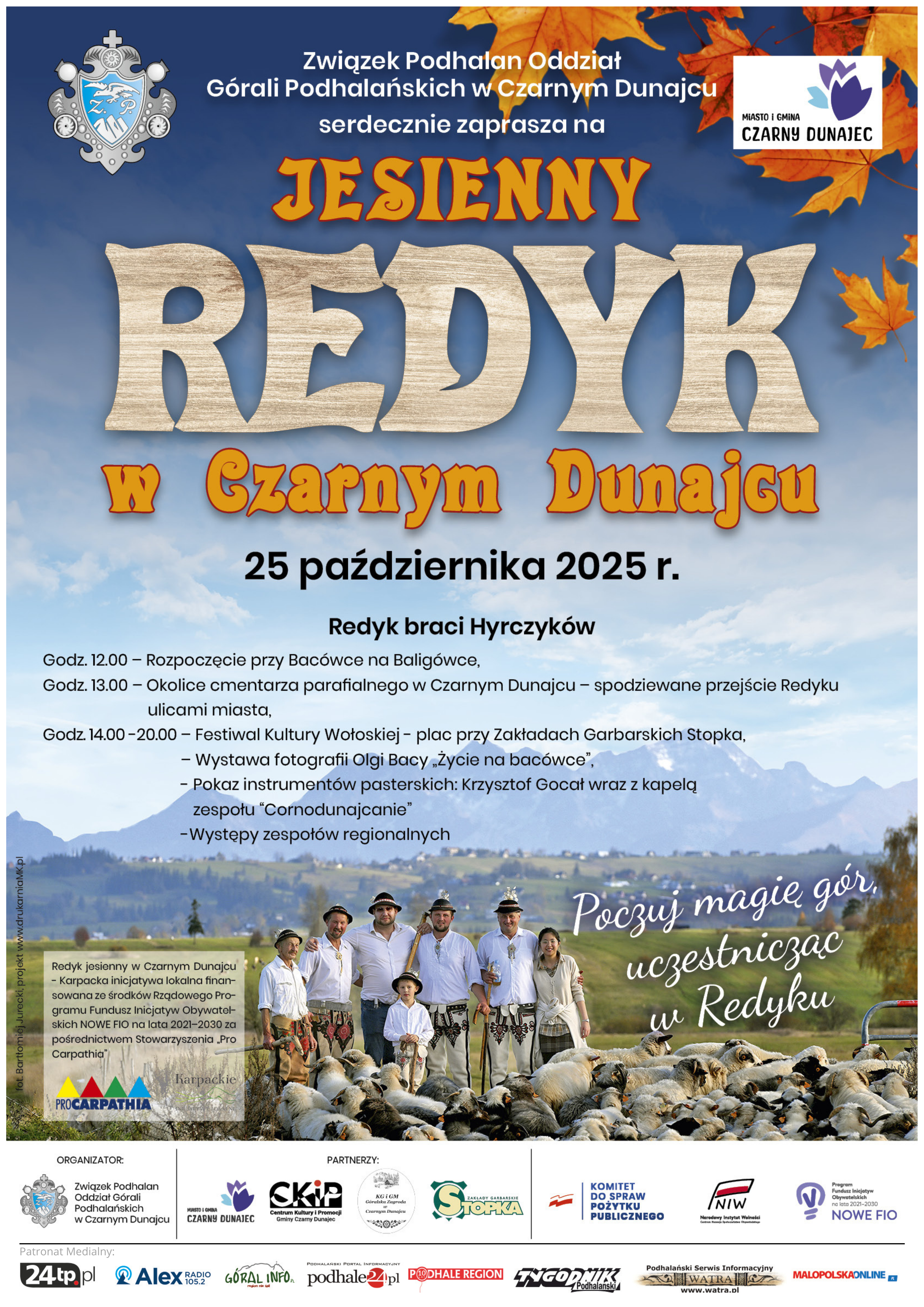 Jesienny Redyk w Czarnym Dunajcu realizowany jest w ramach Karpackiej inicjatywy lokalnej, finansowanej ze środków Rządowego Programu Fundusz Inicjatyw Obywatelskich NOWEFIO na lata 2021–2030 za pośrednictwem Stowarzyszenia na Rzecz Rozwoju i Promocji Podkarpacia „Pro Carpathia”.