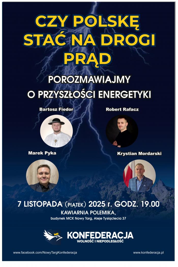 Porozmawiajmy o przyszłości energetyki”. Wydarzenie odbędzie się w piątek, 7 listopada 2025 roku o godzinie 19.00 w Kawiarni „Polemika”, mieszczącej się w Miejskim Centrum Kultury w Nowym Targu. Spotkanie ma na celu przybliżenie uczestnikom aktualnej sytuacji na rynku energii w Polsce oraz przedstawienie możliwych kierunków rozwoju krajowej energetyki. Podczas dyskusji poruszone zostaną kwestie związane z kosztami energii elektrycznej dla gospodarstw domowych i przedsiębiorców, a także z polityką energetyczną państwa.