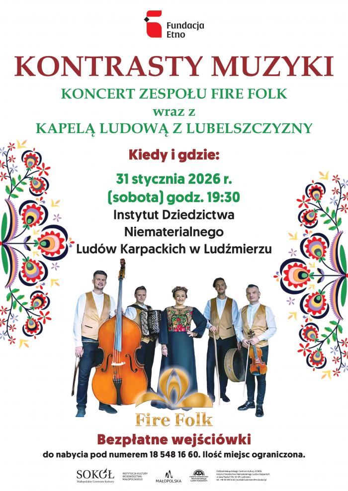 Koncert będzie okazją do spotkania dwóch odmiennych, a jednocześnie uzupełniających się tradycji muzycznych z różnych regionów Polski. Podczas wieczoru publiczność usłyszy góralską muzykę Podhala zestawioną z brzmieniami charakterystycznymi dla Lubelszczyzny. Na scenie wystąpi grupa folkowa Fire Folk, a gościnnie zaprezentuje się Kapela z Wojciechowa z regionu lubelskiego. Artyści pokażą, że różnorodność folkloru może stać się przestrzenią twórczego dialogu i inspirującego połączenia tradycji.