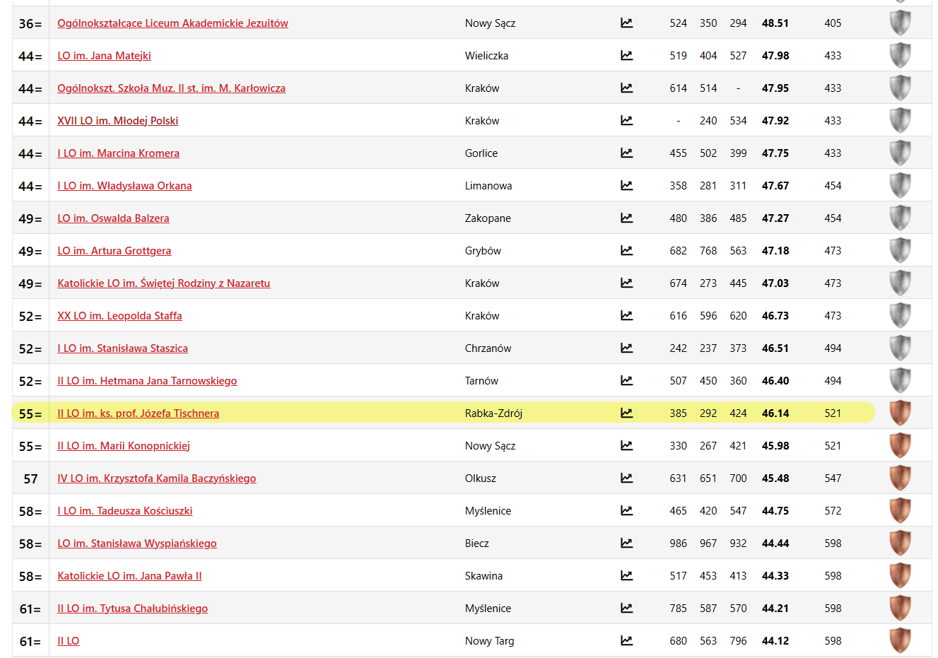 Duży sukces odniosło również Technikum Informatyczne imienia księdza profesora Józefa Tischnera w Rabce-Zdroju. Szkoła ta znalazła się w ścisłej czołówce najlepszych techników w województwie małopolskim, zajmując bardzo wysokie czwarte miejsce. W skali powiatu nowotarskiego technikum uzyskało pierwszą pozycję, co świadczy o jego silnej renomie oraz skuteczności w przygotowaniu uczniów do egzaminów zawodowych. Za tak znakomite wyniki placówka została wyróżniona złotą tarczą Perspektyw, przyznawaną wyłącznie najlepszym szkołom technicznym w Polsce.