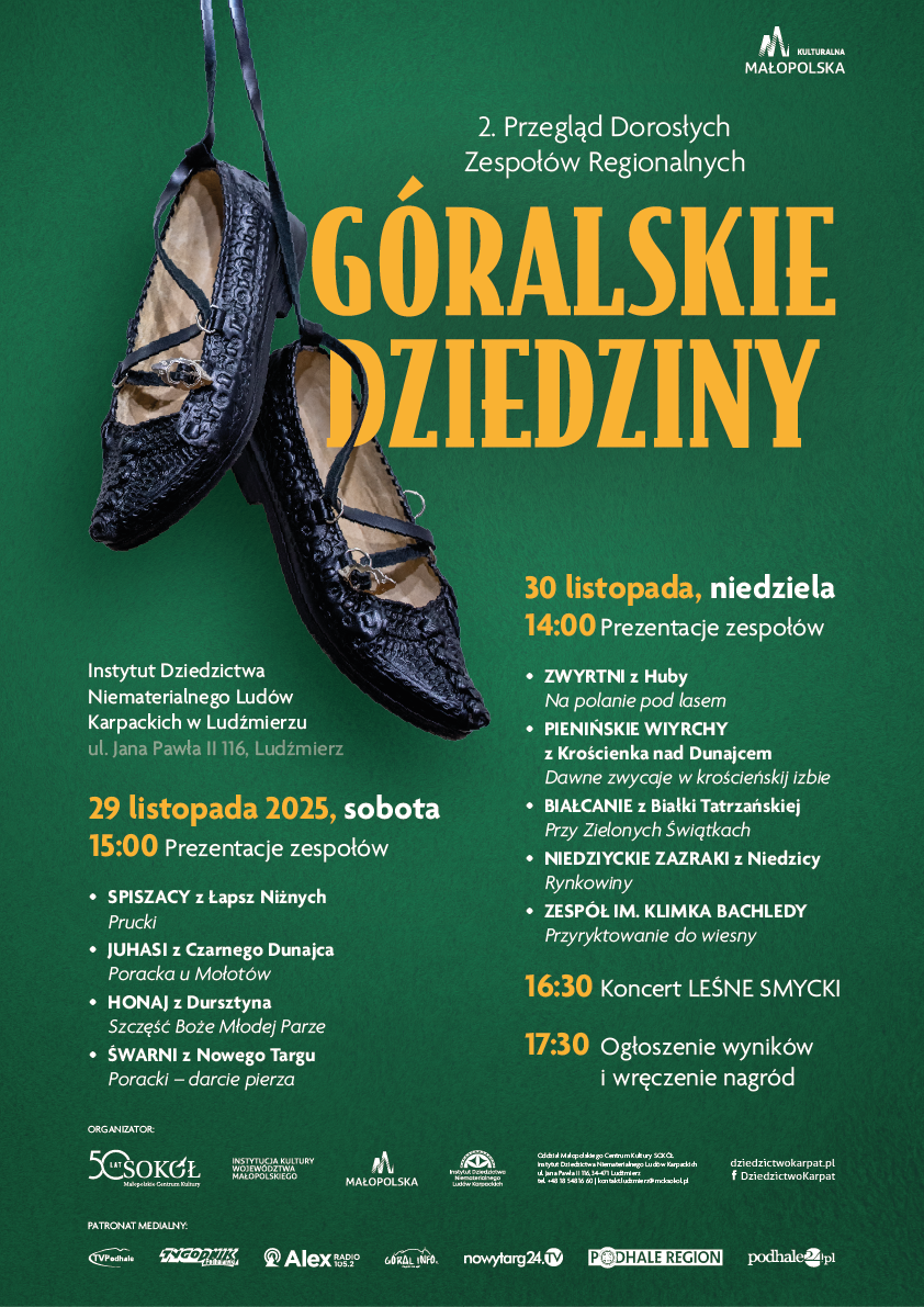 W dniach 29 listopada 2025 w sobotę oraz 30 listopada 2025 w niedzielę odbędzie się druga edycja Przeglądu Dorosłych Zespołów Regionalnych Góralskie Dziedziny. Spotkanie organizowane przez Małopolskie Centrum Kultury SOKÓŁ w Nowym Sączu ponownie zgromadzi grupy prezentujące kulturę Karpat w jej najpiękniejszej formie.