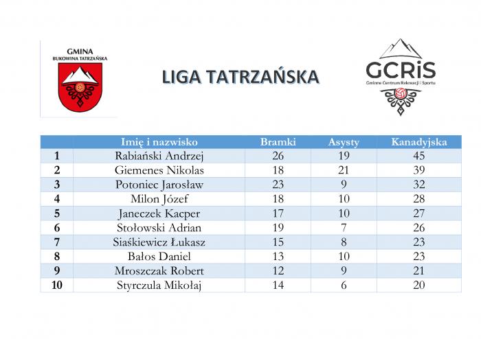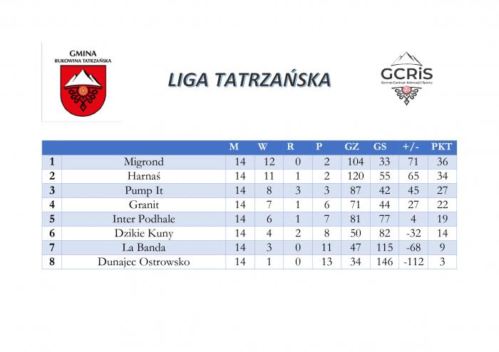 Po zakończeniu wszystkich spotkań mistrzowski tytuł w Lidze Tatrzańskiej wywalczyła drużyna Migrond. Zespół przez cały sezon prezentował równą i skuteczną formę, co pozwoliło utrzymać przewagę nad rywalami w końcowej klasyfikacji. Drugie miejsce w rozgrywkach zajęła drużyna Harnaś, która do ostatnich kolejek pozostawała w walce o najwyższe trofeum. Na trzecim miejscu uplasował się zespół Pump It, który zapewnił sobie miejsce na podium w końcowej fazie sezonu.
