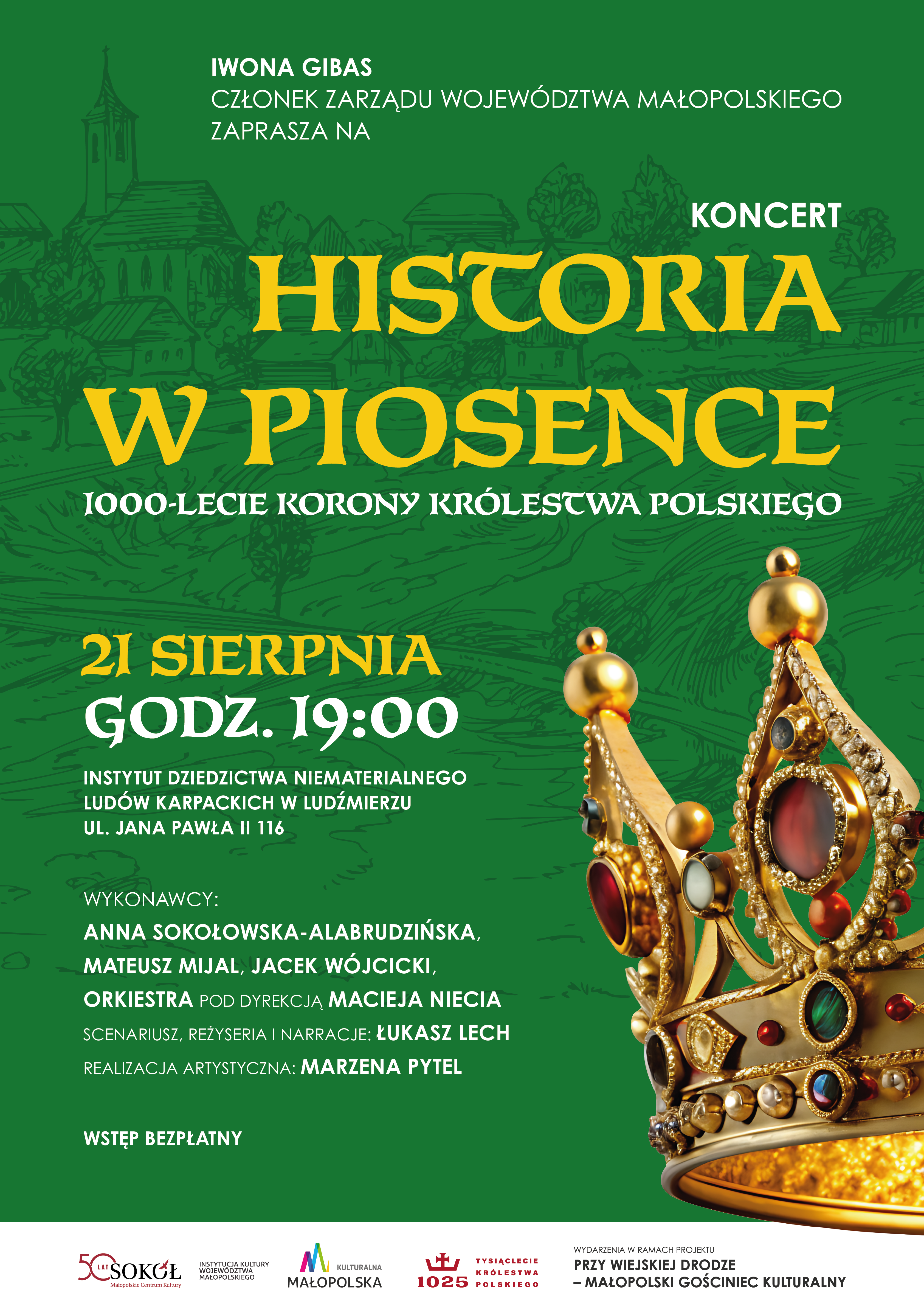 Instytut Dziedzictwa Niematerialnego Ludów Karpackich w Ludźmierzu zaprasza na koncert „1000-lecie Korony Królestwa Polskiego. Historia w piosence”, który odbędzie się 21 sierpnia 2025 roku o godzinie 19:00. Wydarzenie stanowi muzyczną podróż przez kluczowe momenty polskiej historii, od koronacji Bolesława Chrobrego w 1025 roku po czasy współczesne.