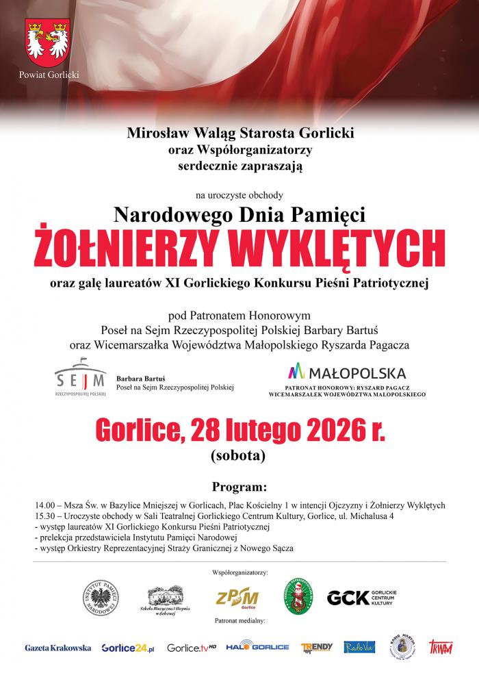 Powiat Gorlicki zaprasza mieszkańców do wspólnego uczczenia Narodowego Dnia Pamięci Żołnierzy Wyklętych. Uroczyste obchody odbędą się w sobotę, 28 lutego w Gorlicach i będą połączone z galą laureatów XI Gorlickiego Konkursu Pieśni Patriotycznej oraz koncertem Orkiestry Reprezentacyjnej Straży Granicznej.