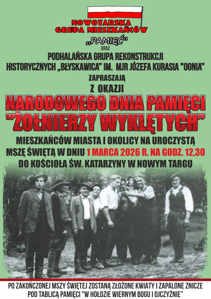 Jako wyraz hołdu, szacunku i wdzięczności odbędzie się w dniu 1 marca (niedziela) o godz. 12.30 w kościele św. Katarzyny w Nowym Targu uroczysta Msza Święta. w intencji "Żołnierzy Wyklętych - Niezłomnych", na którą zaprasza mieszkańców Nowego Targu i okolicy Nowotarska Grupa Mieszkańców "PAMIĘĆ" i Podhalańska Grupa Rekonstrukcji Historycznych "BŁYSKAWICA" im. Józefa Kurasia "OGNIA".