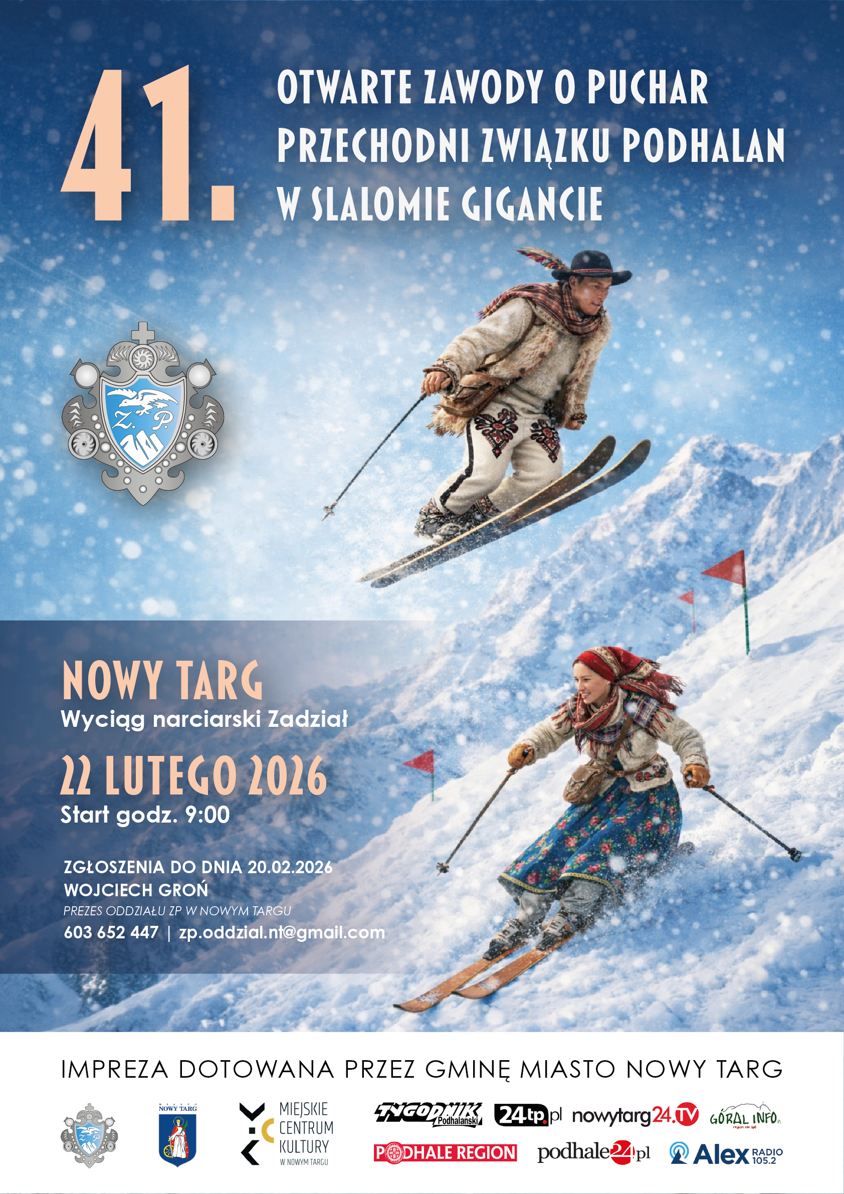 Związek Podhalan Oddział w Nowym Targu zaprasza na 41 Otwarte Zawody Narciarskie o Puchar Przechodni Związku Podhalan, które odbędą się w niedzielę 22 lutego 2026 roku. Początek wydarzenia zaplanowano na godzinę 9.00. Zawody zostaną rozegrane na wyciągu narciarskim Zadział, zlokalizowanym na osiedlu Zadział 2 w Nowym Targu.