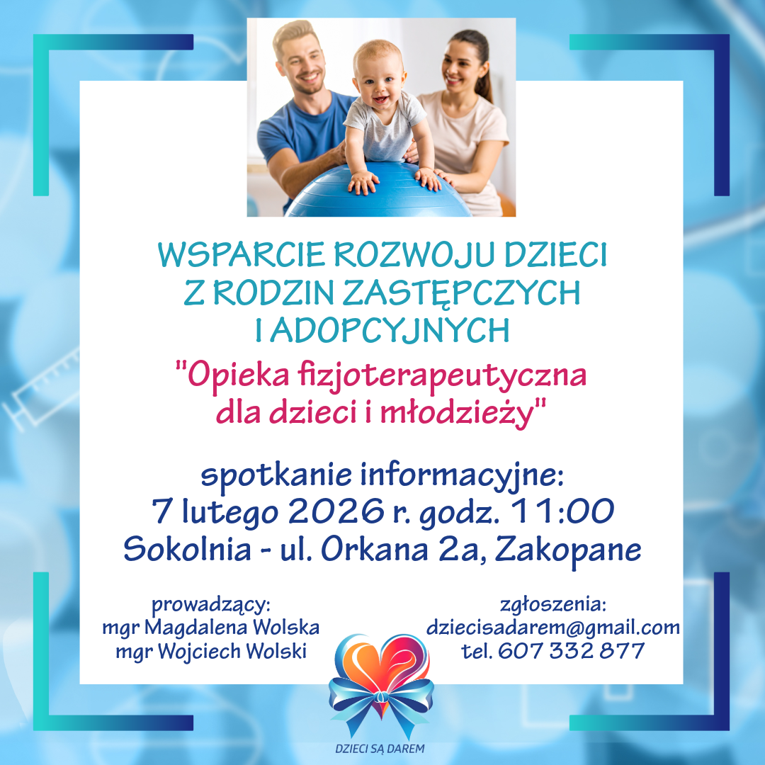 Stowarzyszenie Rodzin Zastępczych i Adopcyjnych „Dzieci są Darem” rozpoczyna nowy projekt skierowany do rodzin zastępczych i rodzin adopcyjnych oraz dzieci i młodzieży wychowujących się w tych rodzinach. Inicjatywa pod nazwą „Wsparcie rozwoju dzieci z rodzin zastępczych i adopcyjnych. Opieka fizjoterapeutyczna dla dzieci i młodzieży” ma na celu zapewnienie specjalistycznej opieki fizjoterapeutycznej, uwzględniającej zarówno potrzeby rozwojowe dziecka, jak i rolę rodziny w procesie terapii.