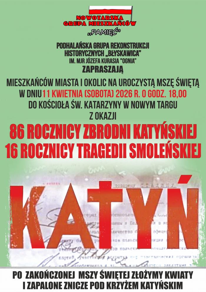 O godzinie 18.00 w kościele świętej Katarzyny zaplanowano uroczystą mszę świętą, która upamiętni dwie ważne rocznice. Chodzi o 86. rocznicę zbrodni katyńskiej oraz 16. rocznicę tragedii smoleńskiej. Jak podkreślają organizatorzy, to czas refleksji, ale też wspólnego zatrzymania się nad historią, która wciąż pozostaje żywa w pamięci wielu mieszkańców.