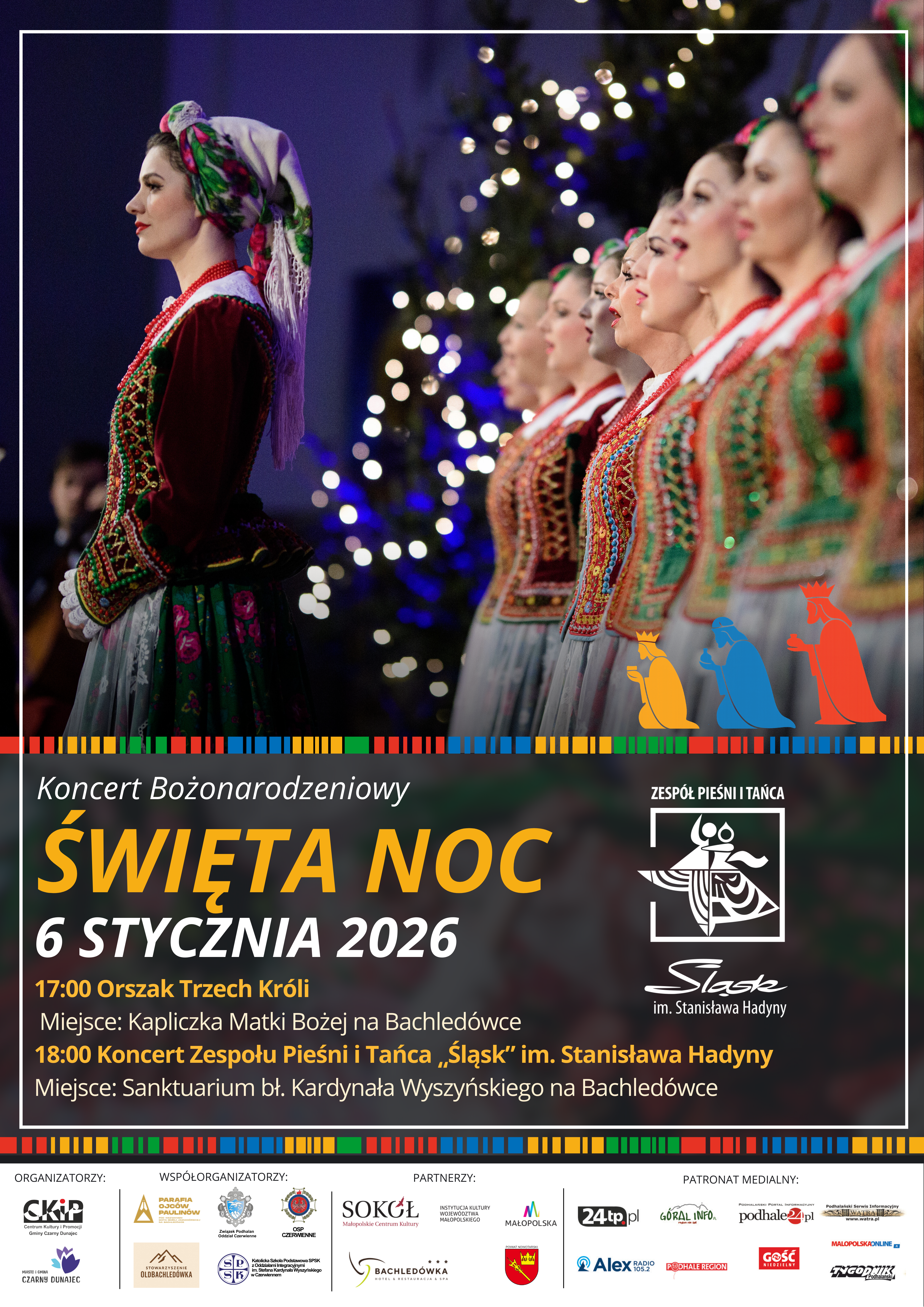 Po zakończeniu orszaku w murach Sanktuarium zabrzmią najpiękniejsze polskie kolędy, wykonane przez artystów Zespołu Śląsk. Występ zespołu, znanego z wysokiego poziomu artystycznego i dbałości o narodowe dziedzictwo, zapowiada się jako wyjątkowe muzyczne przeżycie, wpisujące się w bożonarodzeniowo noworoczną atmosferę Bachledówki.