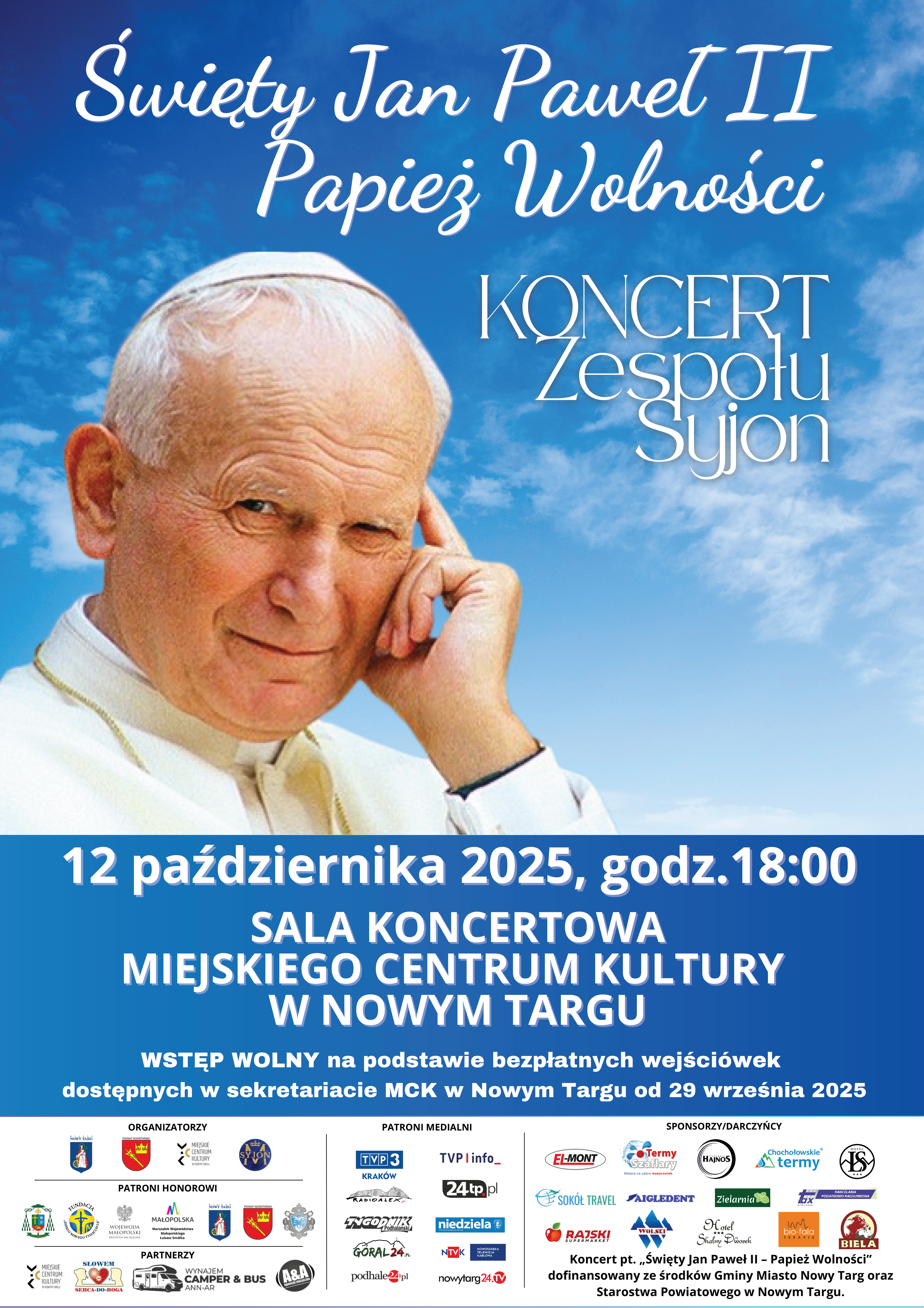 12 października o godz. 18:00 w Sali koncertowej Miejskiego Centrum Kultury w Nowym Targu odbędzie się koncert “Święty Jan Paweł II - Papież Wolności”. Dostęp do tego wydarzenia m. in. dla dzieci, młodzieży, seniorów oraz osób niepełnosprawnych jest bezpłatny. Darmowe wejściówki są do odbioru w sekretariacie MCK.