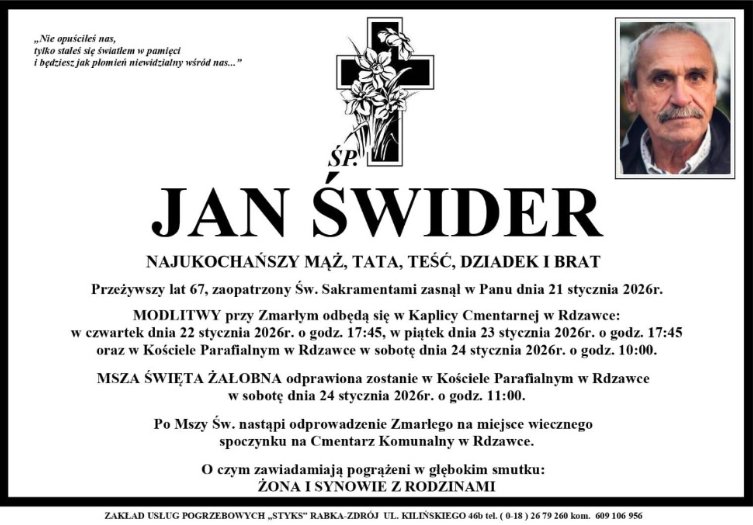 Uroczystości pogrzebowe Jana Świdra odbędą się w sobotę 24 stycznia. Modlitwa przy zmarłym rozpocznie się o godzinie 10.00 w kościele parafialnym w Rdzawce. O godzinie 11.00 odprawiona zostanie msza święta, po której nastąpi odprowadzenie zmarłego na miejscowy cmentarz komunalny.