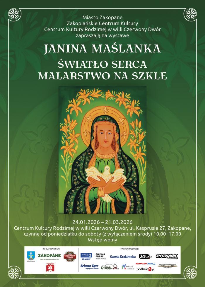 Wystawa prezentowana w willi Czerwony Dwór obejmuje najważniejsze nurty twórczości artystki. Zwiedzający będą mogli zobaczyć liczne prace o tematyce sakralnej, wśród których dominują wizerunki Madonn, aniołów oraz świętych. Obok nich zaprezentowane zostaną sceny rodzajowe ukazujące codzienne życie mieszkańców Podhala oraz dzieła o charakterze refleksyjnym, będące osobistym komentarzem autorki do otaczającej rzeczywistości. Każdy z obrazów stanowi świadectwo głębokiej duchowości oraz wrażliwości Janiny Maślanki na piękno lokalnej tradycji.