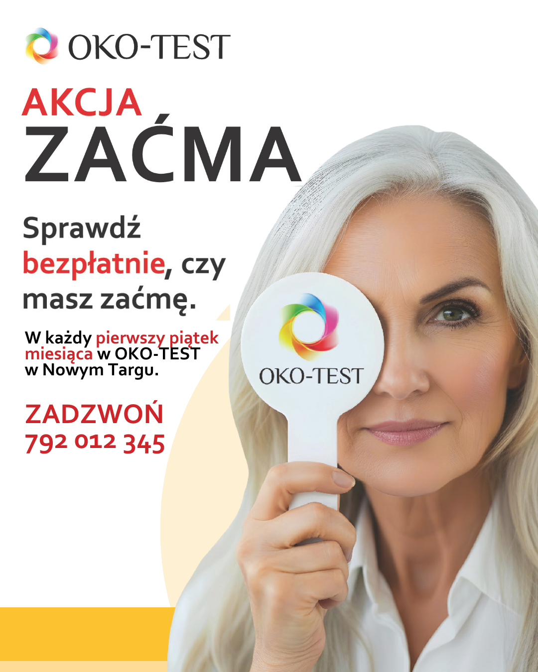 Wychodząc naprzeciw potrzebom pacjentów oraz odpowiadając na realny problem zdrowotny, OKO-TEST w Nowym Targu organizuje cykliczną, bezpłatną „Akcję Zaćma”. Inicjatywa już po raz 3. odbyła się w piątek 10 kwietnia i cieszy się bardzo dużym zainteresowaniem mieszkańców Podhala i okolicznych miejscowości, co potwierdza, jak potrzebne są działania zwiększające dostęp do diagnostyki i leczenia. Kolejna Akcja Zaćma już w piątek 8 maja.