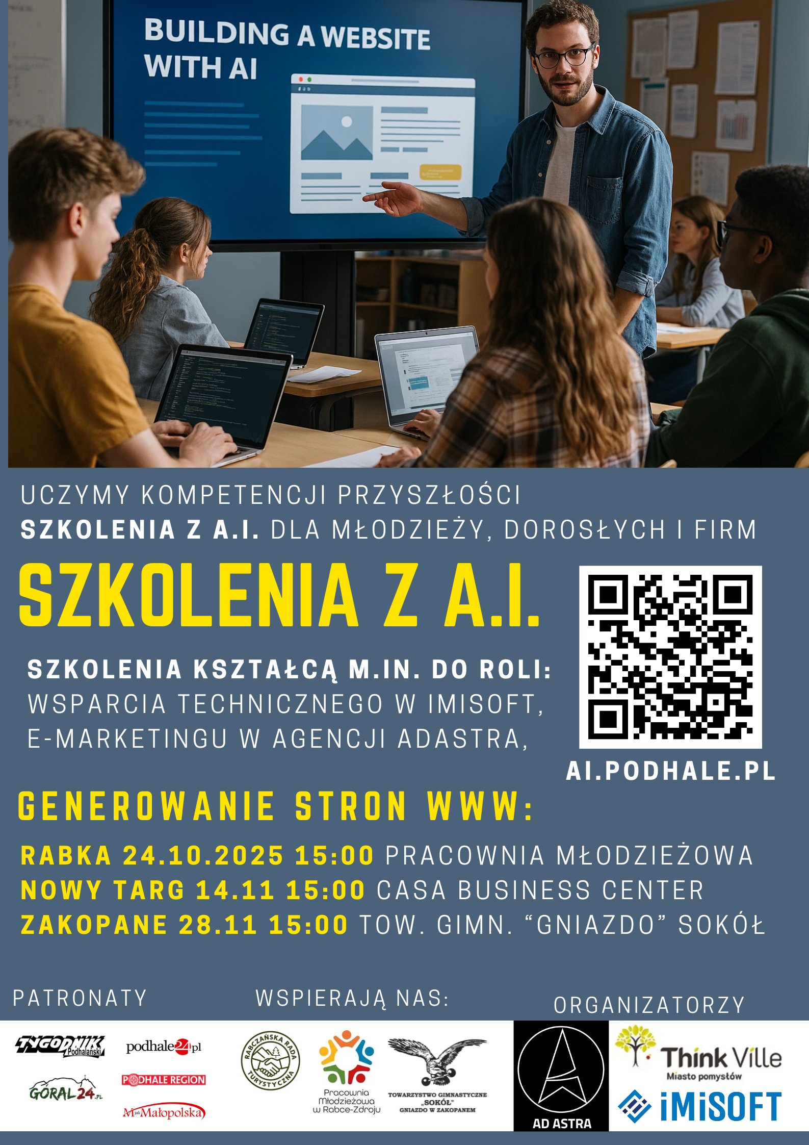 Nowoczesne technologie, praktyczna wiedza i lokalna współpraca - to trzy filary projektu AI.Podhale, który wystartuje już niebawem. Organizatorzy – Stowarzyszenie ThinkVille Miasto Pomysłów, agencja AdAstra oraz firma ImiSoft - zapraszają młodzież i przedsiębiorców z Podhala do udziału w bezpłatnych szkoleniach poświęconych wykorzystaniu sztucznej inteligencji w biznesie i marketingu.