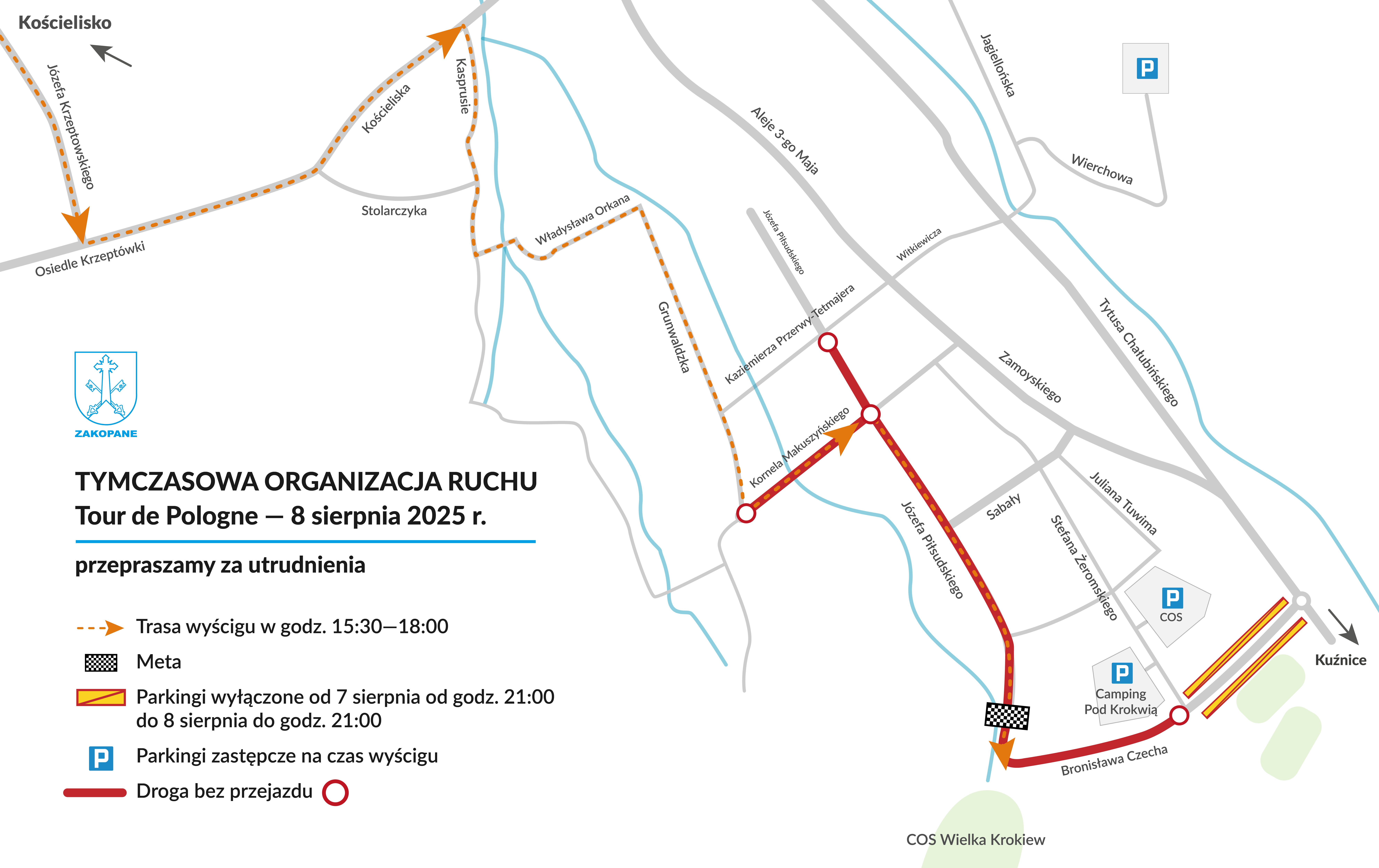 Władze miasta apelują do mieszkańców i turystów o unikanie poruszania się samochodami po Zakopanem w godzinach popołudniowych 8 sierpnia oraz o śledzenie miejskich komunikatów i stosowanie się do poleceń służb porządkowych obecnych na trasie wyścigu.