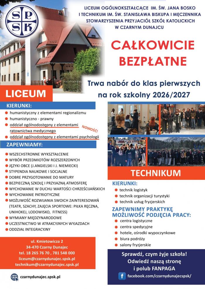Trwa nabór do klas pierwszych na rok szkolny 2026/2027 w Liceum Ogólnokształcącym im. św. Jana Bosko oraz Technikum im. św. Stanisława Biskupa i Męczennika Stowarzyszenia Przyjaciół Szkół Katolickich w Czarnym Dunajcu. Placówka zachęca uczniów do zapoznania się z ofertą edukacyjną, podkreślając, że nauka w szkole jest całkowicie bezpłatna.