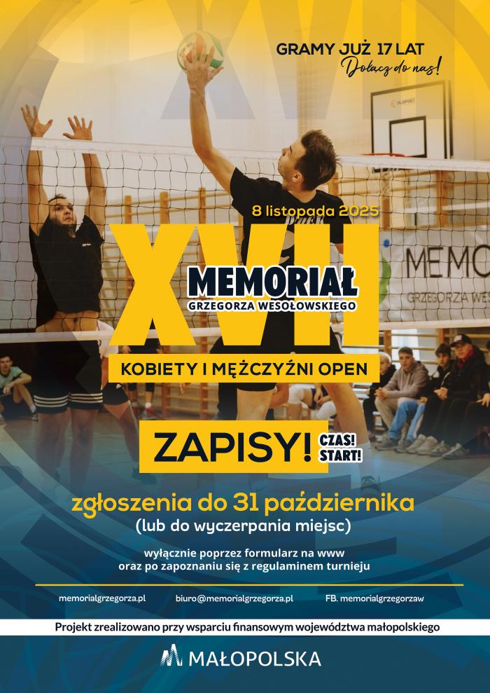 Zapisy do XVII Memoriału Grzegorza Wesołowskiego trwają do 31 października 2025 roku lub do wyczerpania miejsc. Dokonać ich można wyłącznie poprzez formularz dostępny na stronie: www.memorialgrzegorza.pl.