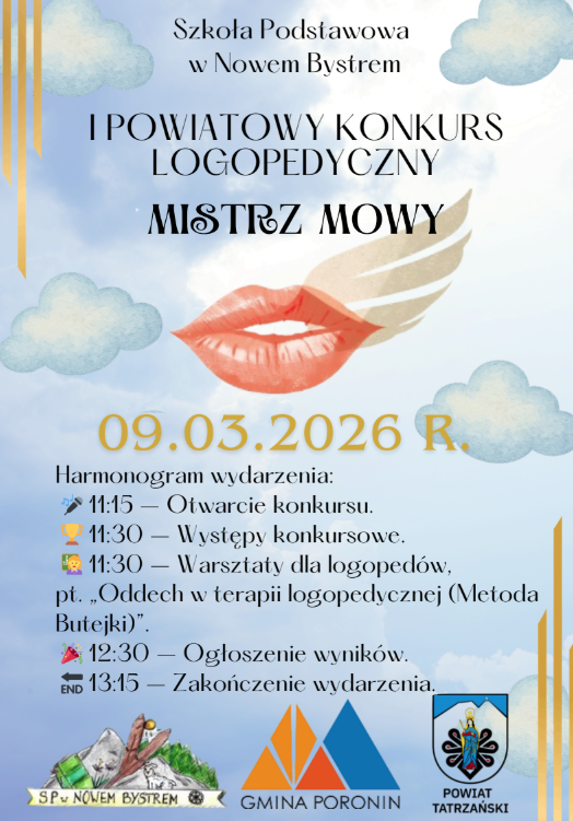 I Powiatowy Konkurs Logopedyczny „Mistrz Mowy” w Nowem Bystrem został objęty honorowym patronatem starosty tatrzańskiego oraz wójta gminy Poronin. Wydarzenie rozpocznie się o godzinie 11.15 w budynku Szkoły Podstawowej im. Bronisława Czecha w Nowem Bystrem.