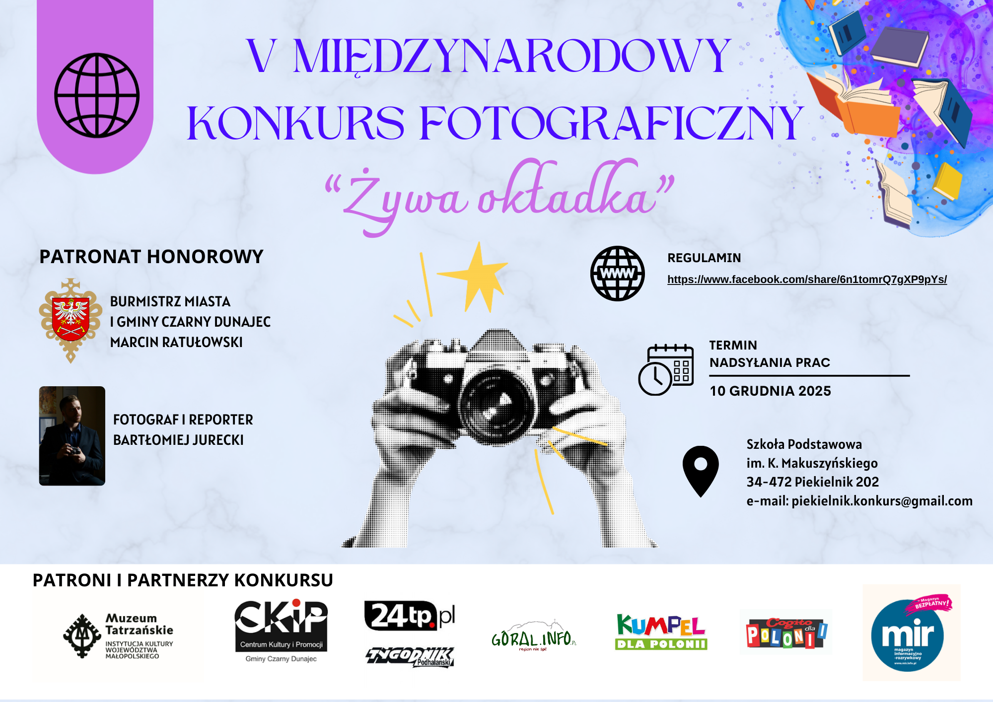 Szkoła Podstawowa im. K. Makuszyńskiego w Piekielniku zaprasza uczniów do udziału w V edycji Międzynarodowego Konkursu Fotograficznego „Żywa Okładka”. Konkurs kierowany jest do uczniów szkół podstawowych z gminy Czarny Dunajec, szkół noszących imię Kornela Makuszyńskiego w całym kraju oraz dzieci i młodzieży polonijnej.