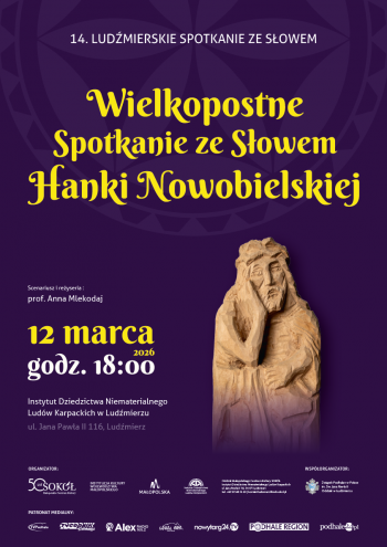 Małopolskie Centrum Kultury SOKÓŁ oraz Związek Podhalan Oddział w Ludźmierzu serdecznie zapraszają na Wielkopostne Spotkanie ze Słowem Hanki Nowobielskiej, które odbędzie się 12 marca 2026 roku o godz. 18:00 w Domu Podhalańskim - Instytucie Dziedzictwa Niematerialnego Ludów Karpackich w Ludźmierzu.