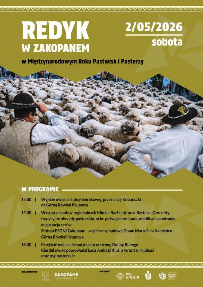Zakopane przygotowuje się do jednego z najważniejszych wydarzeń związanych z kulturą pasterską. W piątek 2 maja 2026 roku ulicami miasta przejdzie tradycyjny redyk, który rozpocznie wiosenny sezon wypasu owiec.