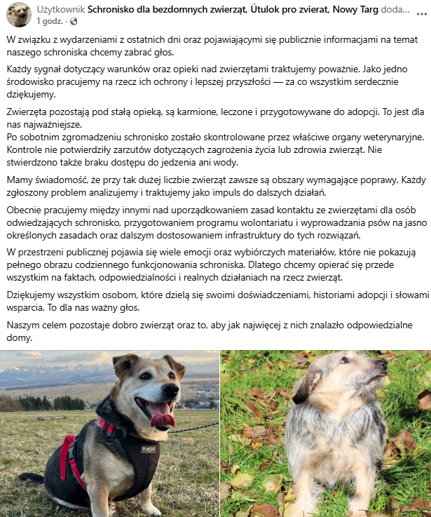 W oświadczeniu wskazano, że zwierzęta przebywające w schronisku pozostają pod stałą opieką, są regularnie karmione, leczone i przygotowywane do adopcji. Jednocześnie zaznaczono, że przy dużej liczbie podopiecznych istnieją obszary wymagające dalszych usprawnień. Każde zgłoszenie jest analizowane i traktowane jako impuls do wprowadzania zmian.