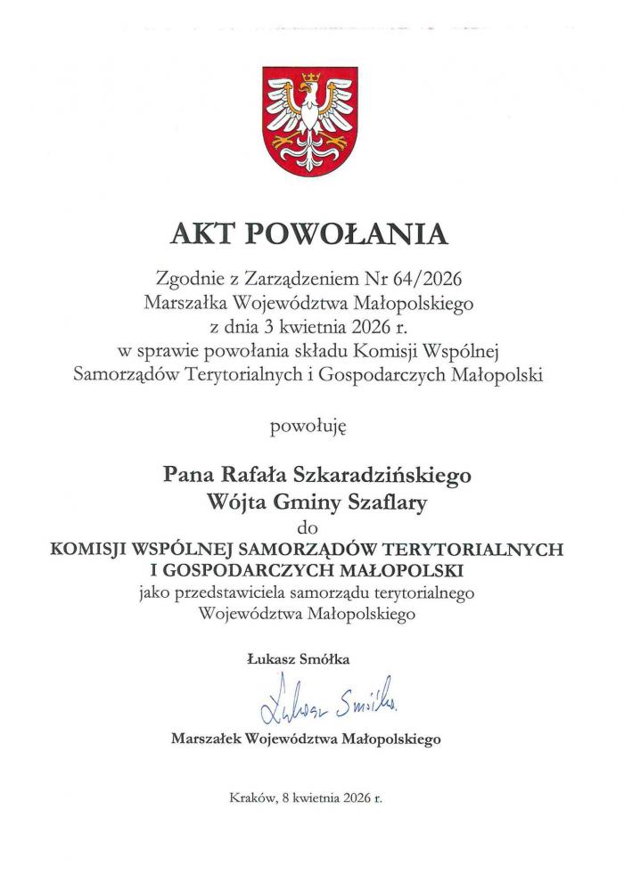 Wójt gminy Szaflary Rafał Szkaradziński został powołany do Komisji Wspólnej Samorządów Terytorialnych i Gospodarczych Małopolski. Akt powołania odebrał w środę 8 kwietnia 2026 roku, dołączając do grona osób uczestniczących w pracach doradczych na poziomie regionalnym.
