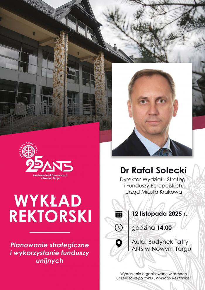 Akademia Nauk Stosowanych w Nowym Targu zaprasza do udziału w pierwszym w nowym roku akademickim wykładzie rektorskim, który wygłosi dr Rafał Solecki, dyrektor Wydziału Strategii i Funduszy Europejskich Urzędu Miasta Krakowa, ekspert w dziedzinie planowania strategicznego oraz wykorzystania funduszy Unii Europejskiej.