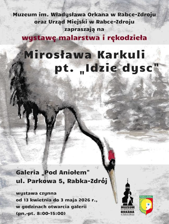 Muzeum im. Władysława Orkana w Rabce-Zdroju oraz Urząd Miejski Rabki-Zdroju zapraszają na wystawę malarstwa i rękodzieła Mirosława Karkuli pt. „Idzie dysc”. Ekspozycja będzie prezentowana w Galerii „Pod Aniołem” przy ul. Parkowej 5.