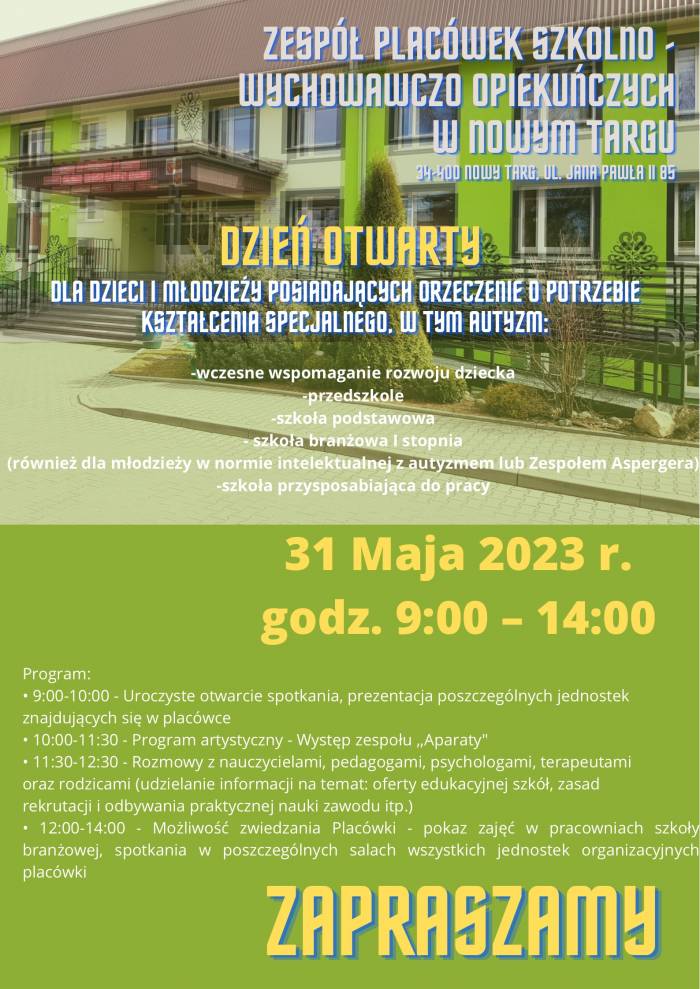 Zespół Placówek Szkolno-Wychowawczo-Opiekuńczych w Nowym Targu zaprasza na Dzień Otwarty.