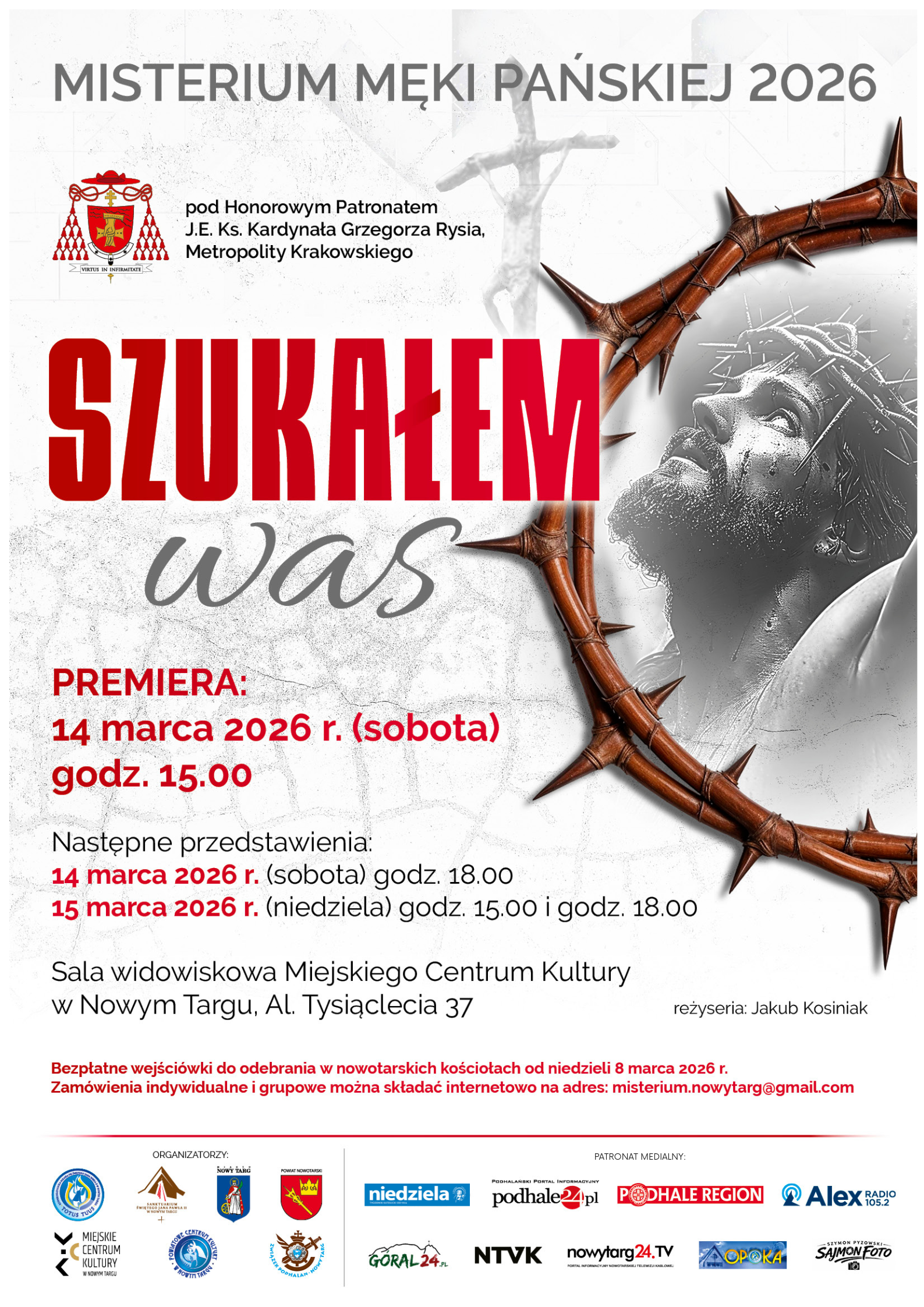 Bezpłatne wejściówki będzie można odbierać w nowotarskich kościołach od niedzieli 8 marca. Organizatorzy przewidzieli również możliwość zgłoszeń indywidualnych i grupowych drogą internetową - mailowo na adres [email protected].