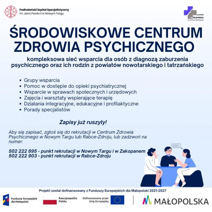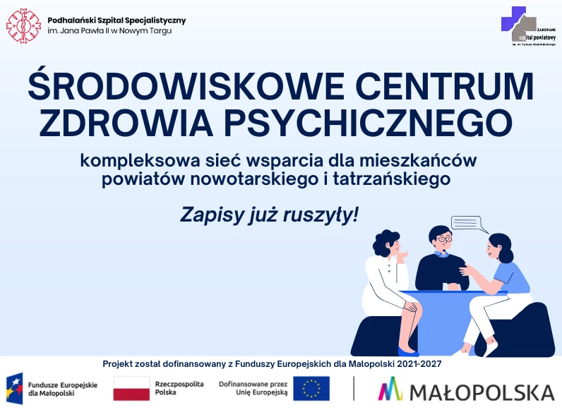 Projekt „Utworzenie Środowiskowego Centrum Zdrowia Psychicznego na terenie POF” jest współfinansowany z Funduszy Europejskich dla Małopolski 2021–2027 i realizowany do II kwartału 2029 roku. Wsparciem zostanie objętych około 4400 osób z powiatu tatrzańskiego i nowotarskiego.